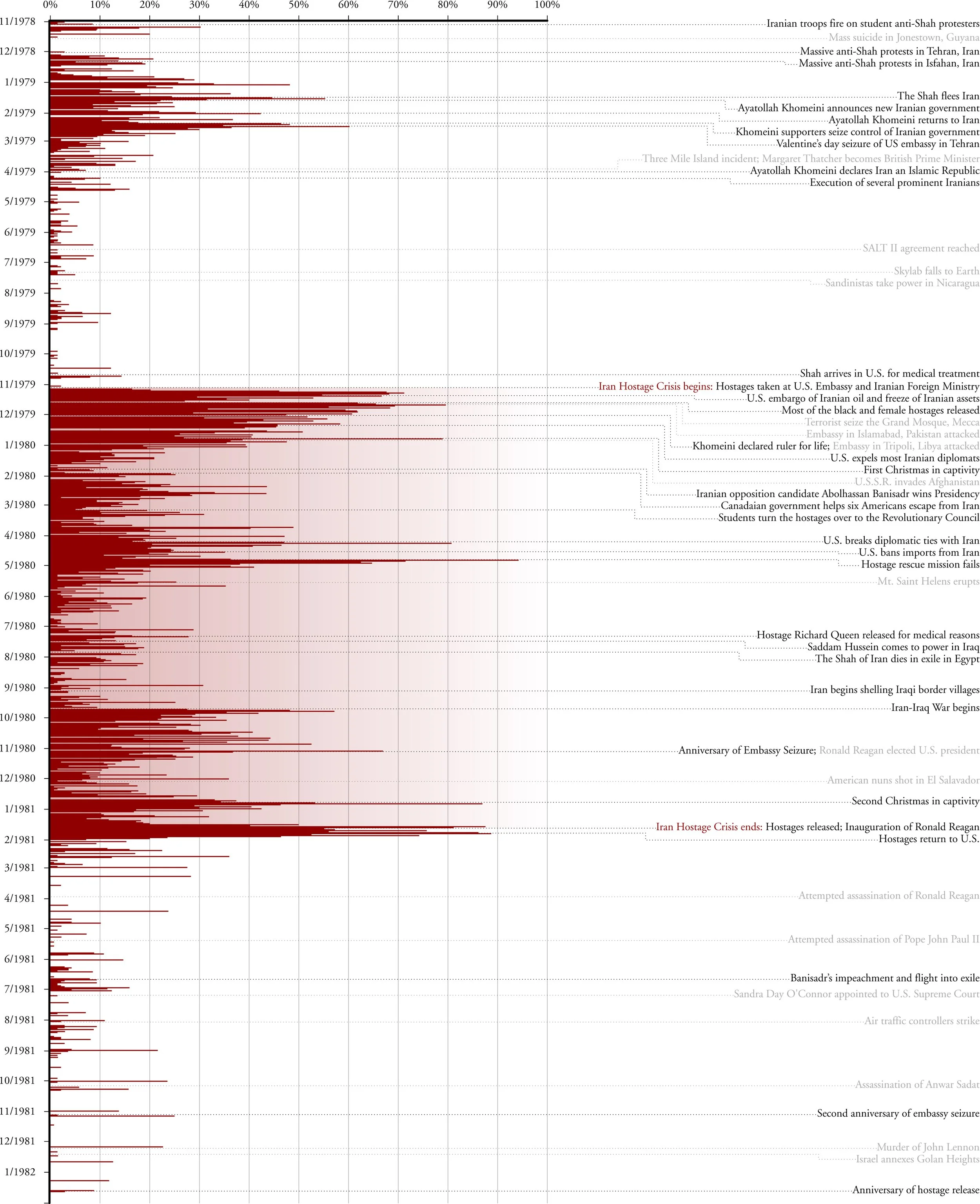 Indeed, the only significant attempts to quantify media coverage of terrorism are Richard Schaffert’s Media Coverage and Political Terrorists: A Quantitative Analysis and Brigette L. Nacos’ Terrorism and the Media: From the Iran hostage crisis to the World Trade Center Bombing. Schaffert makes no cultural claims about the quality or nature of the coverage – rather, he attempts to connect incidences of casualty and mortality in terror attacks to public anger. [23] Nacos, on the other hand, makes excellent use of social and cultural data, connecting the crisis and a handful of other terrorist events to public opinion and presidential approval. But her scope of analysis is limited to the early months of the crisis, missing an opportunity to measure changing public attitudes and presidential fortunes against the duration of the crisis. [24] Journalism and popular history texts on the subject of the media and terrorism likewise deal very little with pre-September 11 incidents and, when they do, treat situations such as the Iran hostage crisis only as historical background, regurgitating the conventional historiography and offering little analysis. [25] Thus, Shooting the Ayatollah fills a quantitative gap in the cultural and media history of the Iran Hostage Crisis and corrects inaccuracies in the prevailing historiography, buttressing future media and cultural analyses.