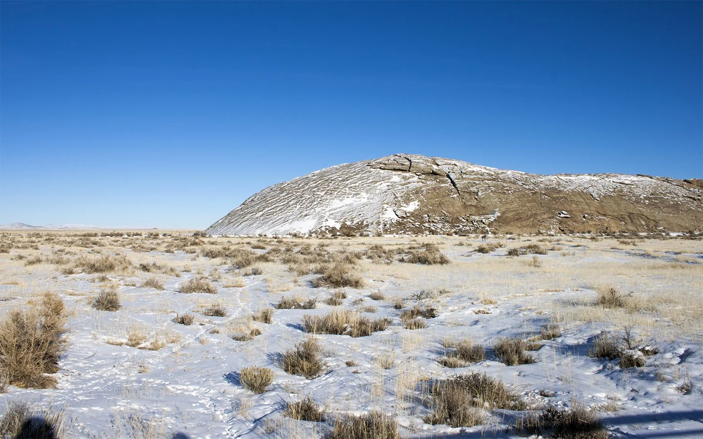 But within half an hour or so heading north, ice on the highway cleared and the snow fell away and brown earth and grasses peeked up around us on all sides. It was gorgeous! Mountains and mesas cut up the landscape and this one peak stood high above the rest off to the northwest. I was driving, so Scott messed with his phone to figure how far off it was—fifty miles, when we first saw it. Clear as if it was right next to the road.