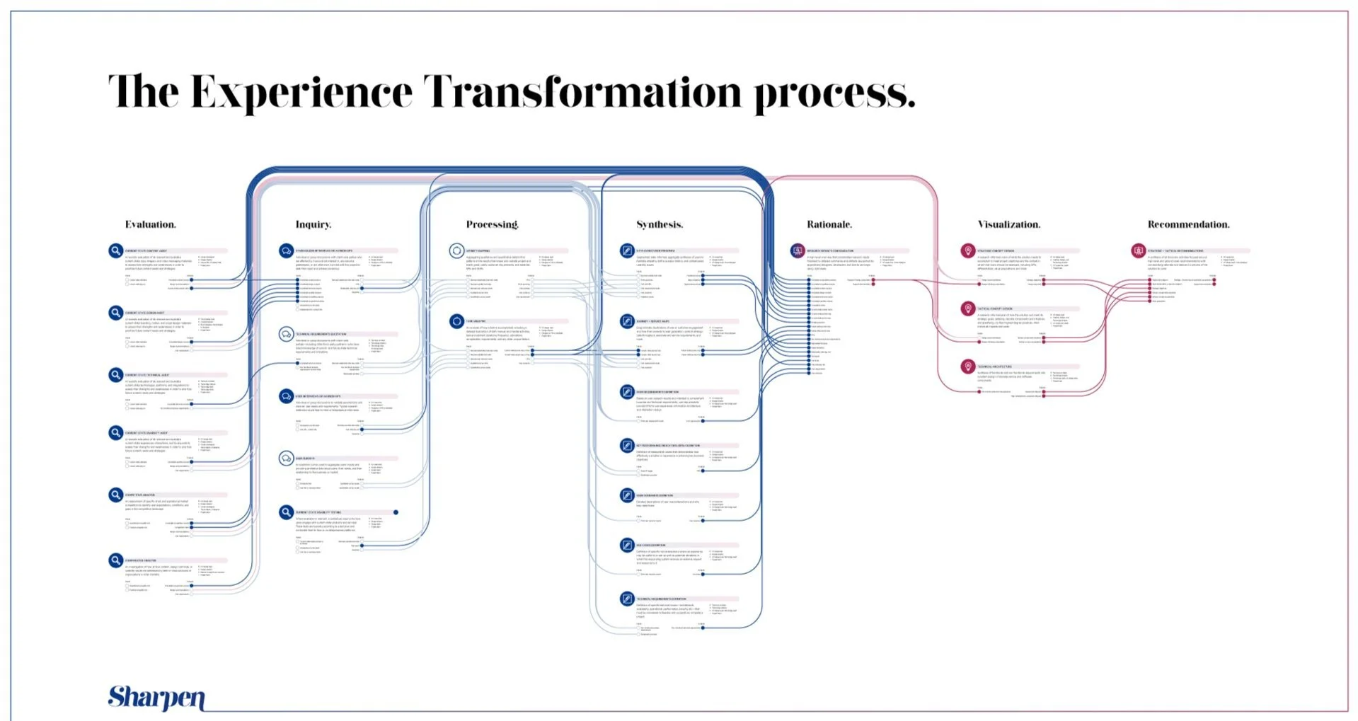 Experience Transformation is Sharpen’s tested and repeatable process for elevating both the user’s experience and the business’ results through the rigorous application of design-thinking principles and an omnichannel approach to tactical execution.