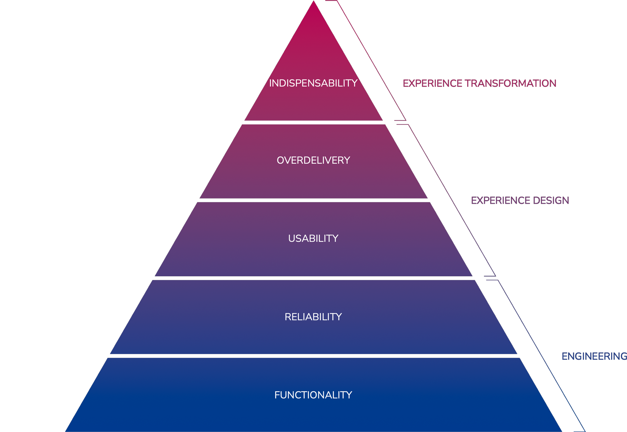 Maslow’s Hierarchy of Needs informs how we look at product health and market potential. Typically, this hierarchy caps out with “overdelivery” (or some synonym). But our point of view is that there’s further room to climb beyond simple innovation or disruption. That if you let user needs lead and adapt your business and requirements to suit, your business may reach that rarest of peaks—indispensability. (Illustration by the author)