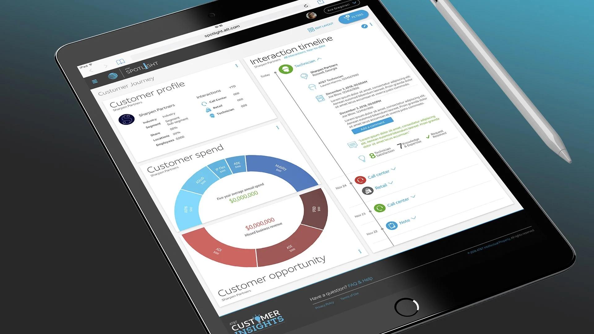 When we were brought in to work on Spotlight, an AT&T customer-insights dashboard for their business sales and support teams, we immediately saw the opportunity to alleviate this particular customer pain point. Our recommended “Interaction timeline” aggregated every contact between the customer and the business into a single, indispensable view, so any support associate could see a holistic view of all the customer’s interactions.