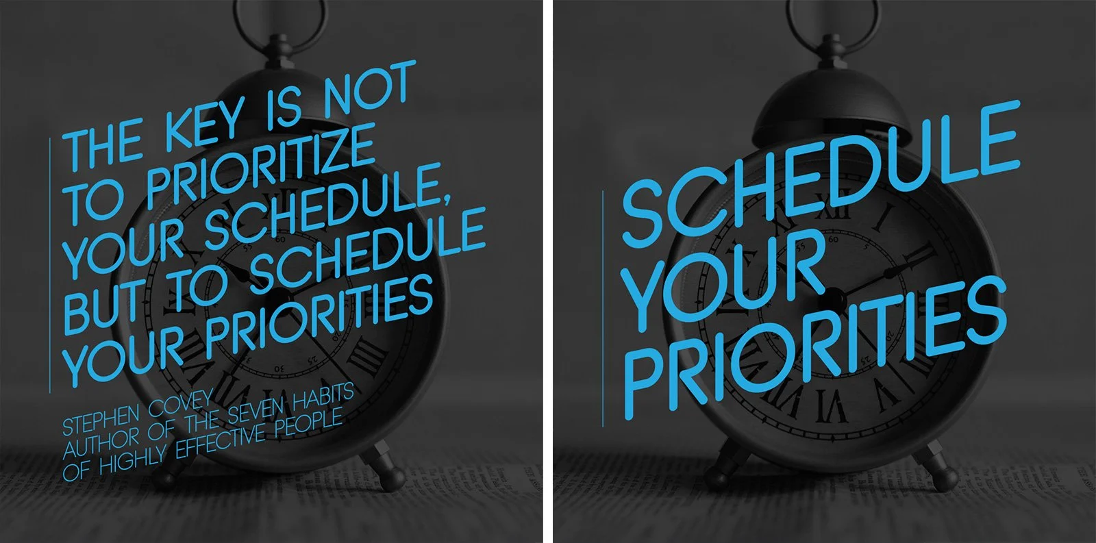 Because the things that are important to each of us — not necessarily urgent — need time in our schedules if they’re going to provide us with genuine and lasting self-actualization. These are our priorities. And you know what you’re supposed to do with priorities.